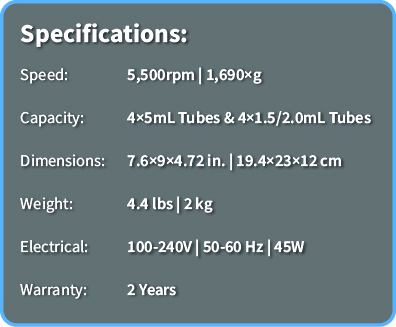 The myFuge™ 5D digital mini centrifuge includes a four position rotor that accepts a variety of 5mL tubes (including 5mL snap-cap and screw-cap centrifuge tubes, as well as 5mL blood and culture tubes). In addition, the rotor has four positions for standard microtubes (1.5/2.0mL) and offers optional adapters for 2mL cryotubes, 0.2mL PCR tubes, and 0.5mL microtubes, making it one of the most versatile and compact centrifuges in its class.